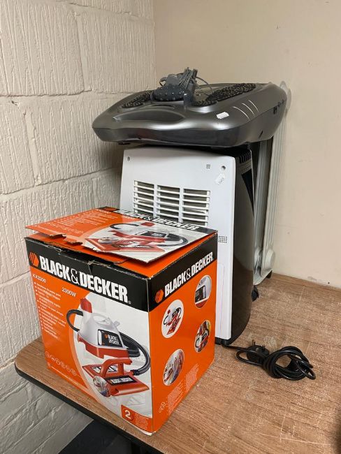 A Black and Decker wall paper stripper, Bio energiser foot massager, Beldray oil filled radiator and dehumidifier