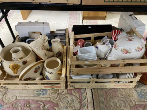 Three crates of china, dinner ware, kitchen storage jars and mugs, large pig money bank etc