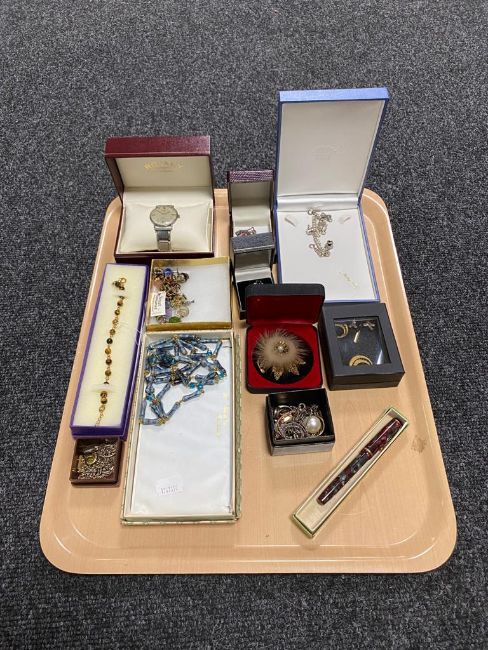 A tray of a quantity of costume jewellery, Burnham fountain pen with 14ct gold nib