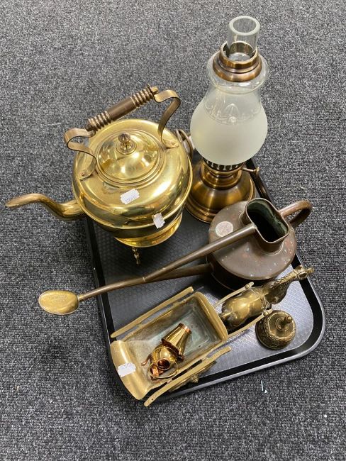 A tray of copper galvanised watering can, brass ware, kettle on trivet, horse and cart, bell etc