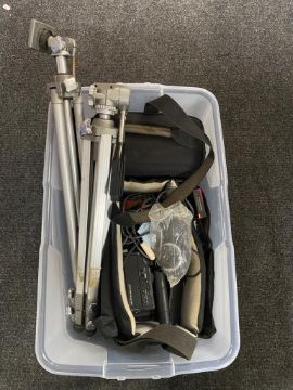 A clear plastic storage crate with lid containing camera tripods and two camcorders in carry bags