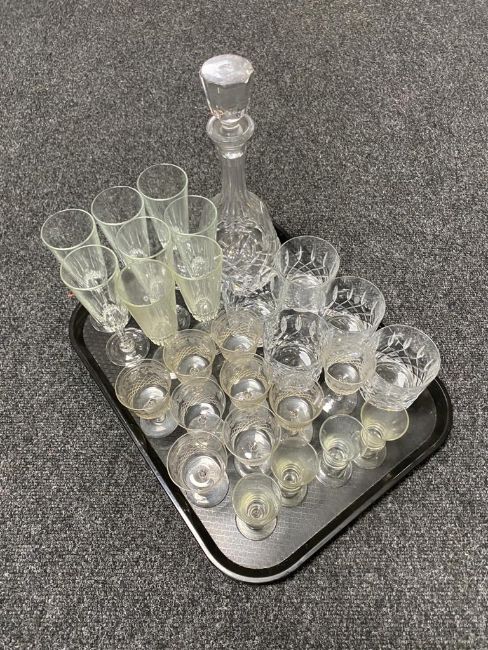 A cut glass decanter together with a tray of assorted glass