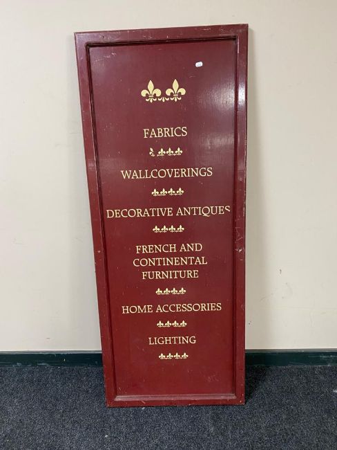 A painted panel 'Fabrics, Wall Coverings and Antiques'