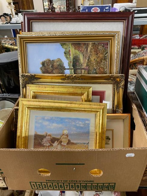 A box of pictures and prints, Margaret Pemberton oils on board, map of Durham, framed mirror etc