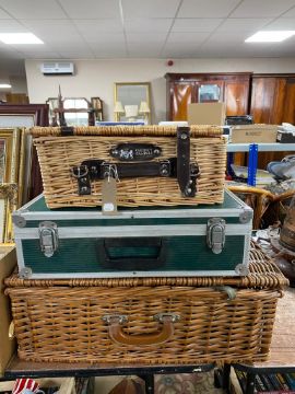 All three are generally in good condition. The larger wicker hamper does not have its original leather straps.