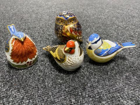 Four Royal Crown Derby bird paperweights with stoppers to include goldfinch, blue tit, Christmas robin and owl (Owl with silver stopper, others gold)