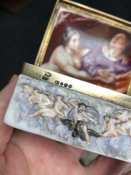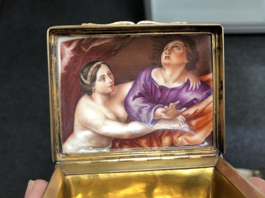 A fine quality Victorian silver gilt trinket box, London 1855, adapted from an earlier porcelain trinket box, with lid interior painted with a religious scene, width 8cm