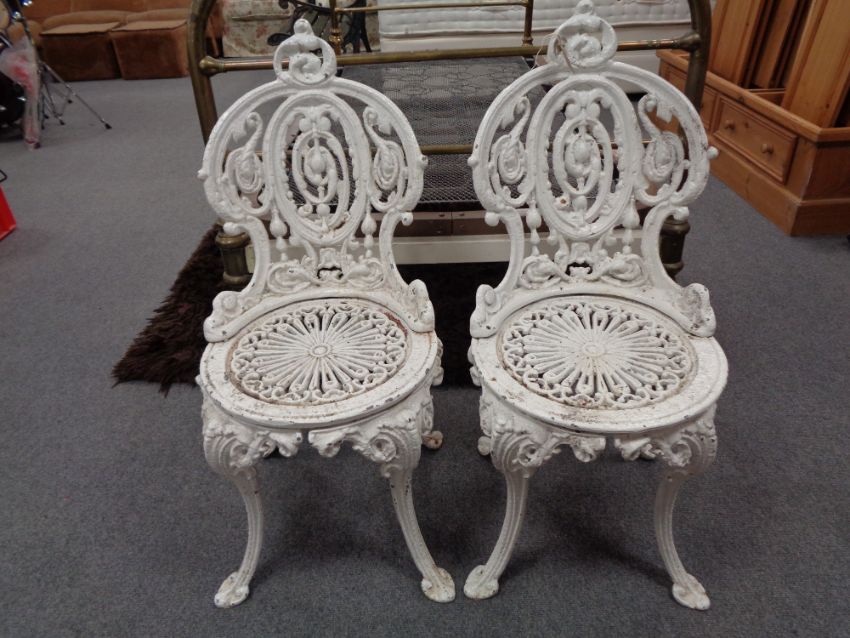 A pair of painted cast iron patio chairs