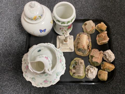 A tray of eleven Lilliput lane ornaments, Aynsley lidded vase, Portmeirion etc