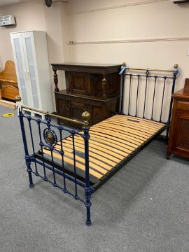 A painted wrought iron and brass 3' bed frame