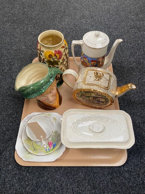 A tray of assorted china to include Royal Doulton character jug 'Arriet', Indian Tree vase, teapots etc