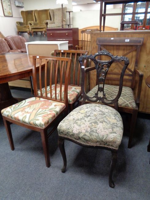 A Victorian inlaid mahogany armchair together with a bedroom chair and pair of spindle backed chairs