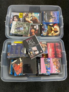 Two plastic storage crates with lids containing DVD's, CD's etc