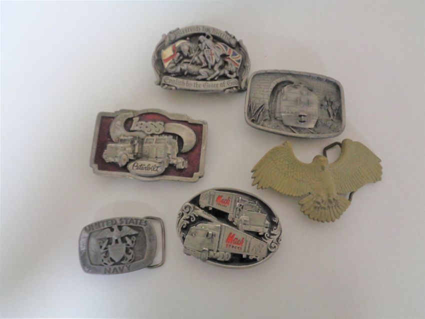 A box of six assorted metal belt buckles, Mack trucks, united states Navy, golden eagle etc