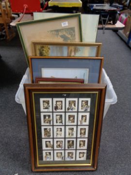 A box of assorted framed pictures and prints, framed Japanese watercolour, Russell Flint print, legends of Hollywood cards, J M Johnson watercolour of a rowing boat etc