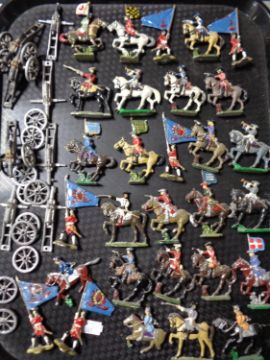 A tray of early twentieth century hand painted lead figures, military figures on horseback, flag bearers etc