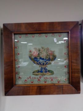 A Victorian mahogany framed needlework - flowers in a bowl by Ann Nicholson