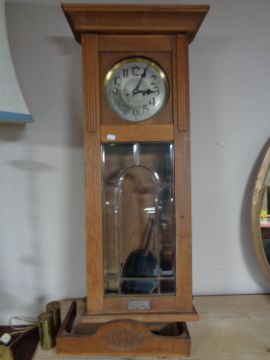 An early twentieth century oak cased wall clock with silvered dial, pendulum, weights and key