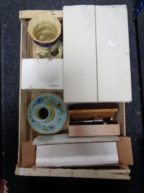 A box of boxed corkscrew, Shorter and Sons large character jug - King Neptune, continental pottery vase etc