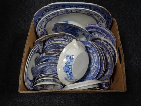 A box of antique blue and white meat plates, serving plates etc