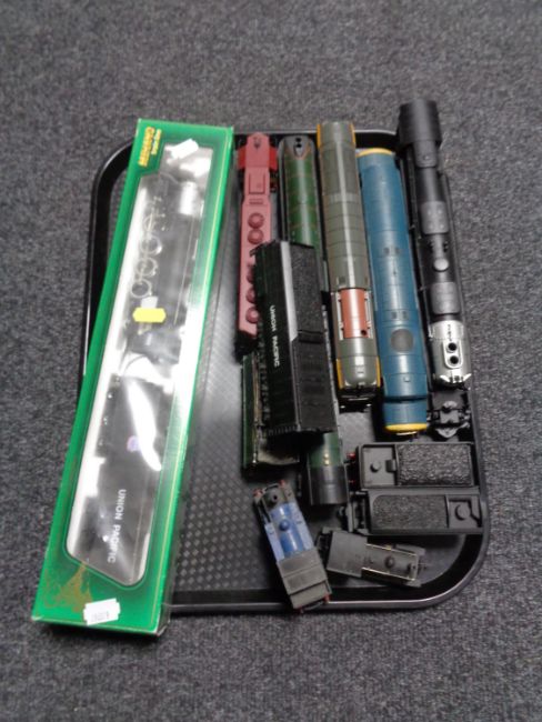 A tray of boxed Mehano HO scale Union Pacific locomotive and tender, tray of Hornby and Janof rolling stock