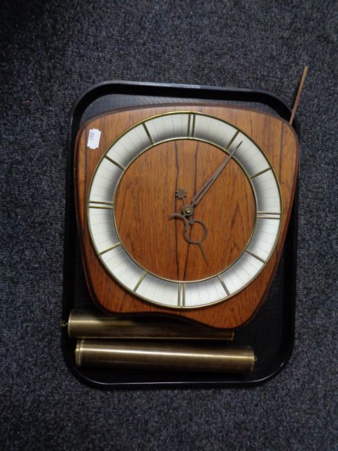 A mid century walnut wall clock with pendulum and weights