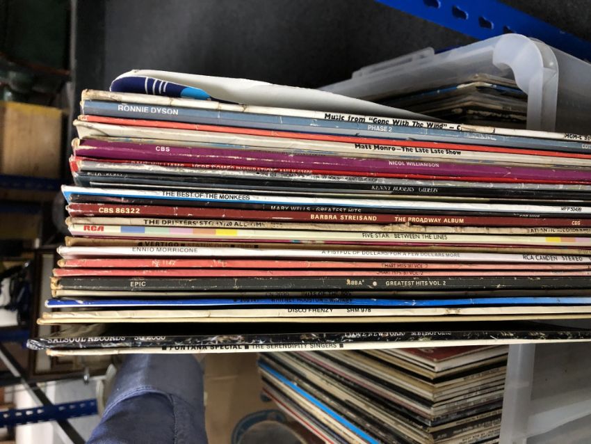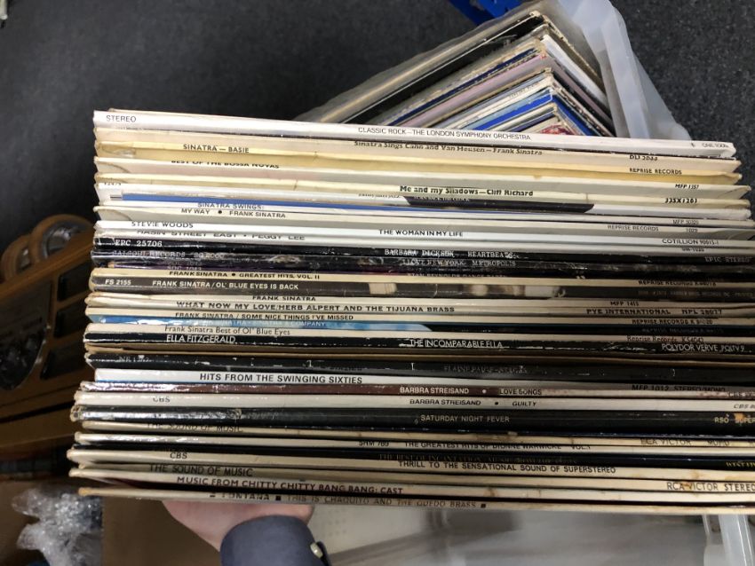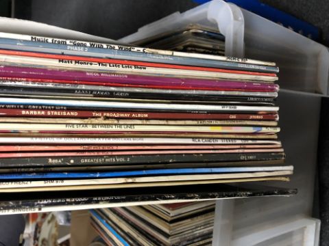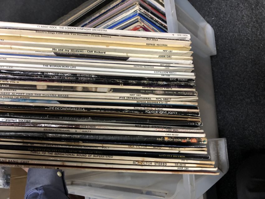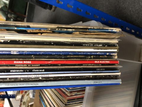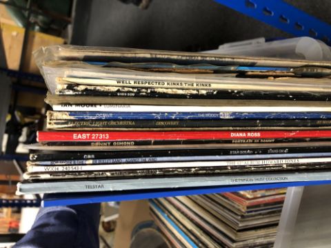 A plastic crate of LP's, pop and rock including Rolling Stones, ELO etc