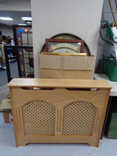 A set of pine shelves together with a radiator cover and box of assorted pictures, brass plaque