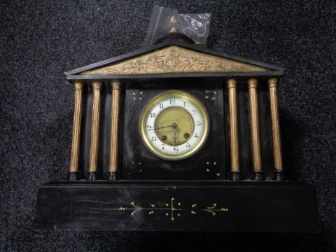 A Victorian slate gilt highlighted mantel clock with pendulum and key