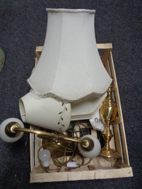 A box of brass table lamps, glass lamp shade etc