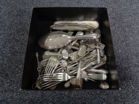 A box of silver plated cutlery, coins, two silver brush backs, mirror back etc