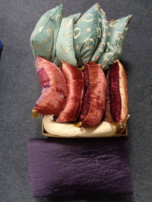 Two boxes of cushions, throw