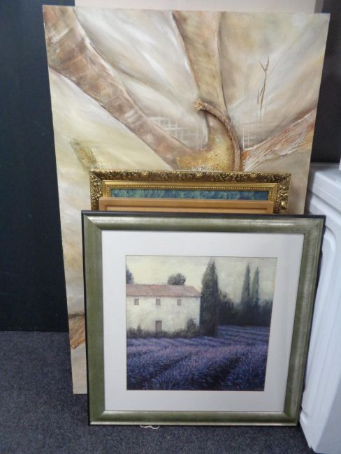 A gilt framed photograph - aerial view of house together with a contemporary wall canvas, framed print and three flowers