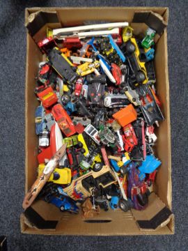 A box of mid century and later die cast vehicles, plastic pond yacht
