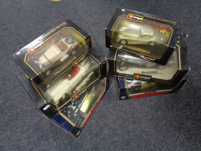 Five boxed Burago 1/20 1/24 scale die cast vehicles including Mercedes, jaguar, Alpha Romeo etc