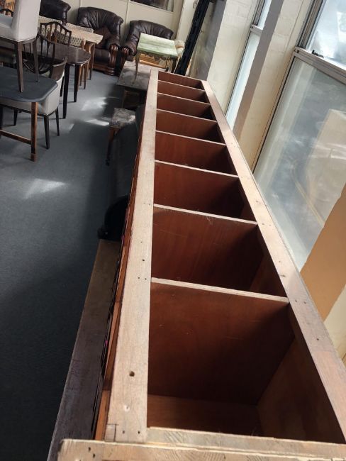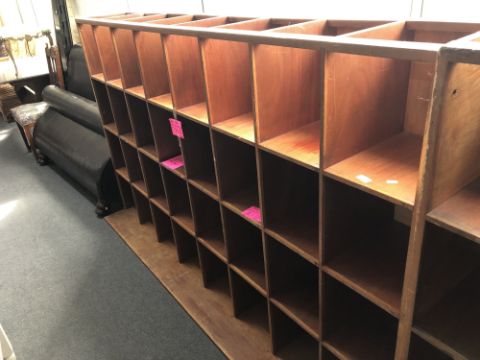 A 20th century haberdashery pigeon hole cabinet with thirty two compartments width 217 cm x depth 36 + plinth, 132 cm height