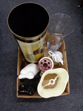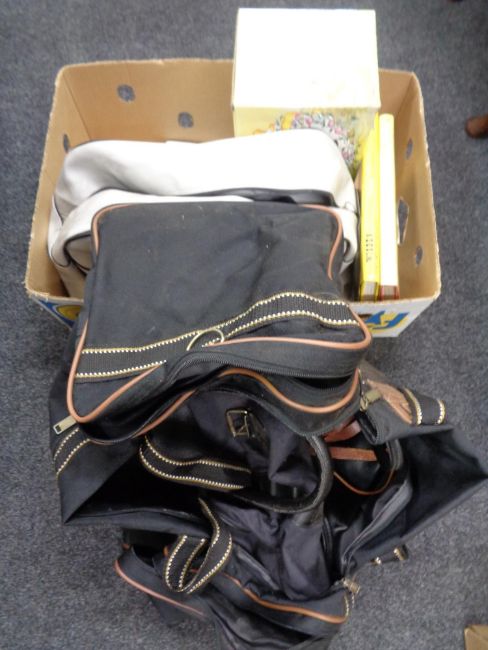 Two boxes of holdalls, books, mid century metal stick stand, glass vase etc