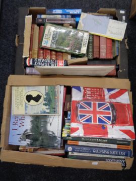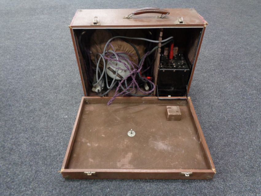 Five boxes of holdalls, books, typewriter, glass bowl, china, cased vintage speaker