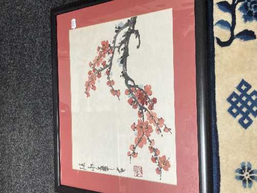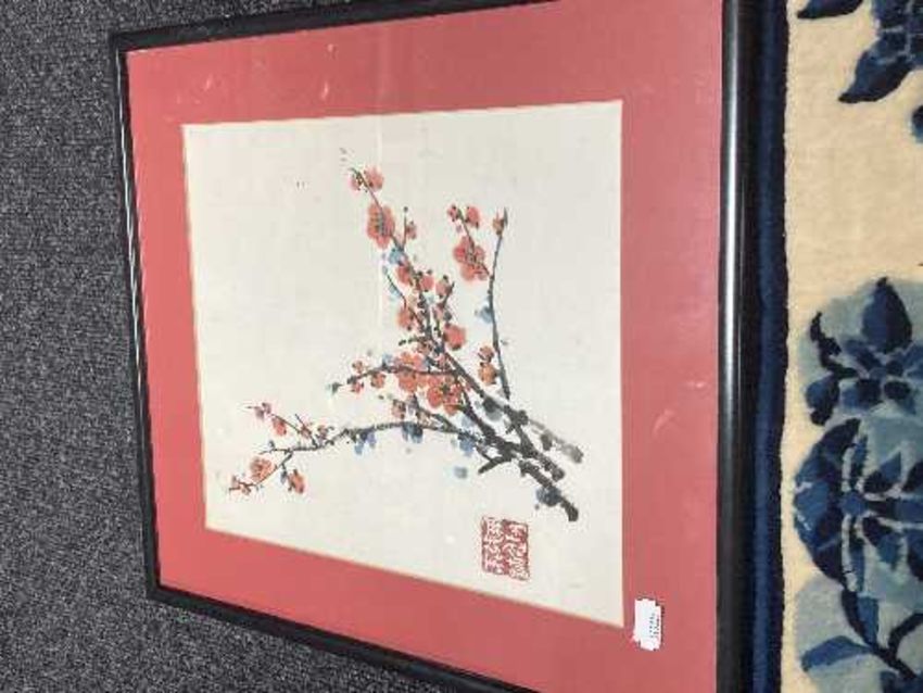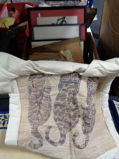 A box of Japanese prints, signed limited edition print, Art Deco monochrome print, tapestry etc