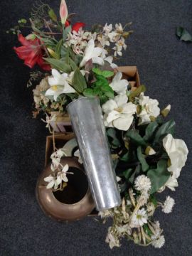 Two boxes of framed prints, artificial flowers, two star mirrors