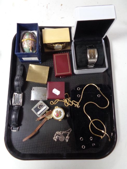 A tray of gent's wristwatches, DKNY, decorative eggs, Penguin lighter, costume jewellery etc