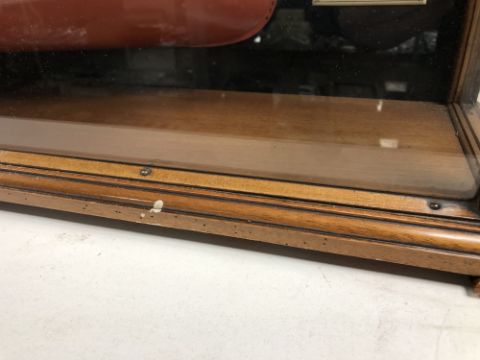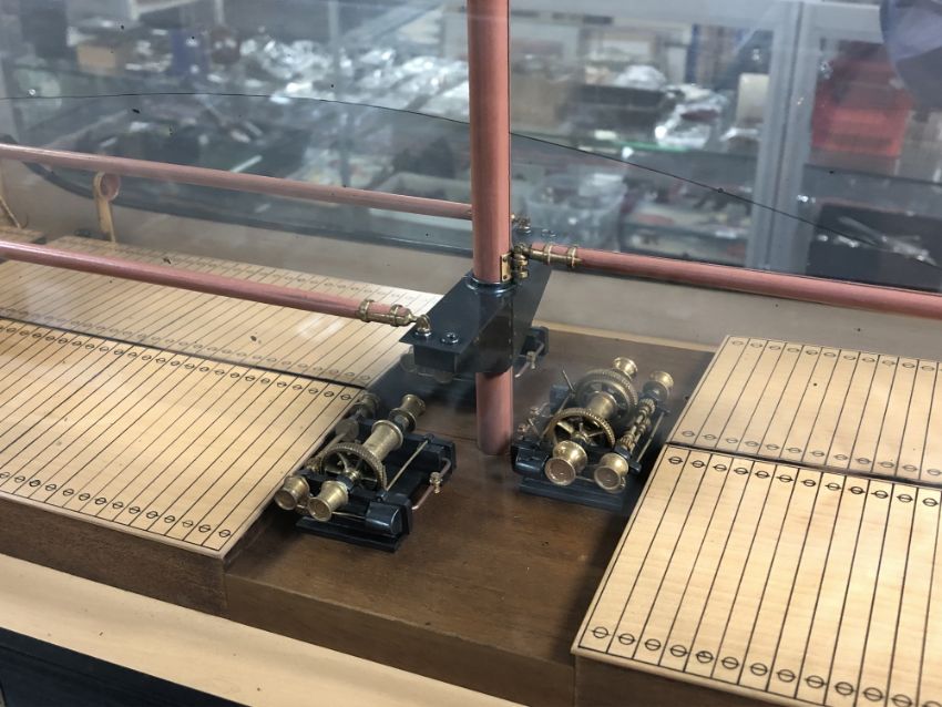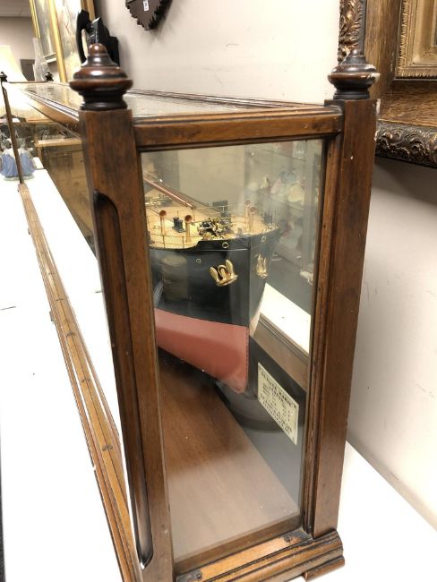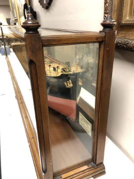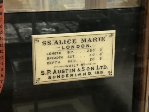 An exceptional model of the S.S. Alice Marie, built by S. P. Austin & Son, 1915, with carved laminated hull, lined wooden varnished decks with metal fittings, steam funnels, superstructure, lifeboats on winch, propeller and other details, a half-model with mirrored back to create the illusion of a fully-built model, housed within a glazed mahogany display case measuring 219cm long by 5.5cm high by 23cm deep.