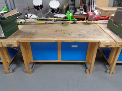 An Lervad school wood working bench fitted with internal drawers and four vices