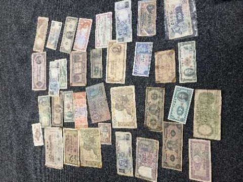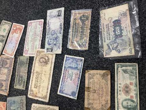 A tin of world banknotes, various