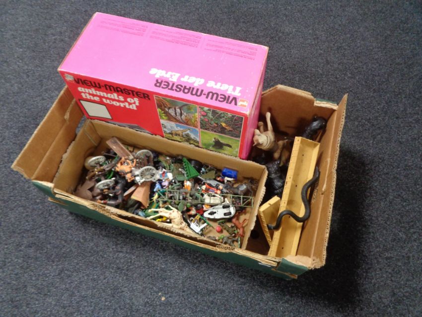A box of toys, boxed viemaster, animals of the world, plastic soldiers etc