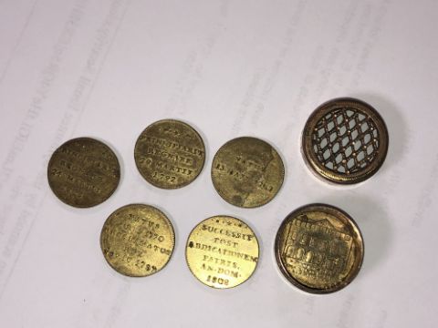 A rare set of Georgian brass tokens in original gilded box by E. Thomsons manufactory Birmingham, depicting European heads of state.