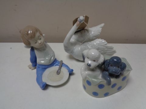 Three Nao figures - Boy, swan and puppies in basket