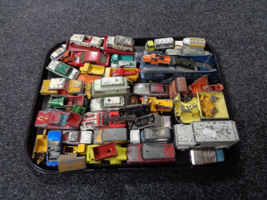 A tray of mid century and later play worn die cast vehicles, Dinky, Corgi etc