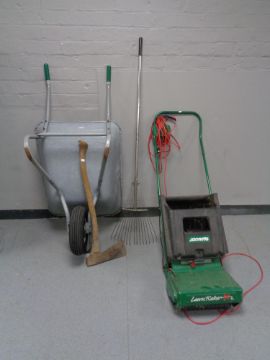 A metal wheel barrow together with a qualcast electric lawn mower, garden rake and axe