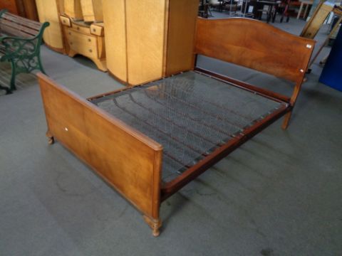 A 1930's walnut 4'6" bed frame with Vono box spring CONDITION REPORT: Width 140 cm, length 198 cm - would fit a mattress length 190 cm.Headboard height max 104 cm. Good condition, surface scuffs and needs re finishing.